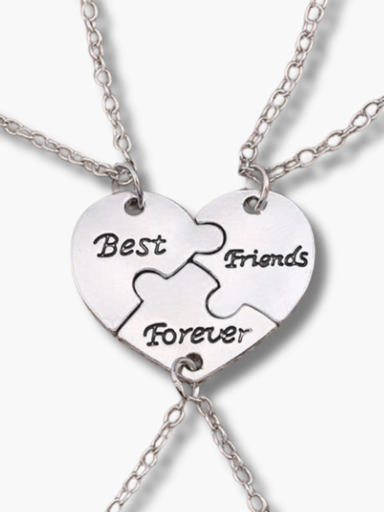 Discover the ultimate in friendship with our friendship necklaces. Designed especially for inseparable threesomes, these jewels embody the perfection of a flawless friendship. Constituent of pendants in puzzle, once assembled, they form a whole heart on which draws the soft message: "best friend forever". Each one is unique, but they all fit together in perfect harmony, just like your friendship. The entire heart is engraved with the message "best friend forever", symbolising the promise of an eternal friendship. By wearing these matching necklaces, each friend is constantly reminded of the strong bond that unites them to the other two, materialising the complementarity and uniqueness of your trio. They're the perfect gift for birthdays, special occasions or simply to celebrate the uniqueness of your threesome.