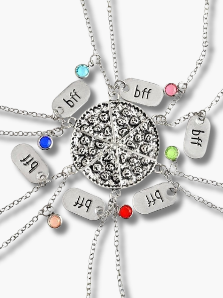 This BFF Necklaces Pizza includes six gorgeous silver-tone chain necklaces, each adorned with a delicious pizza slice pendant. Share the love with your best friends! This set includes six identical necklaces, so you and your friends can wear best friend necklace. Made from high-quality silver chain, these friendship necklaces are not only elegant, they'll stand the test of time. The main feature of these necklaces set is the adorable pizza slice pendant. It perfectly represents your shared love of pizza parties and unforgettable moments spent together. Whether you're looking for a thoughtful gift for your best friends or want to commemorate the strength of your friendship, these matching necklaces for best friends are the perfect choice. Each necklace features an adjustable chain, ensuring a comfortable fit for everyone. These necklaces for best friend can be worn individually or combined with other jewelry, making them a versatile addition to any outfit.