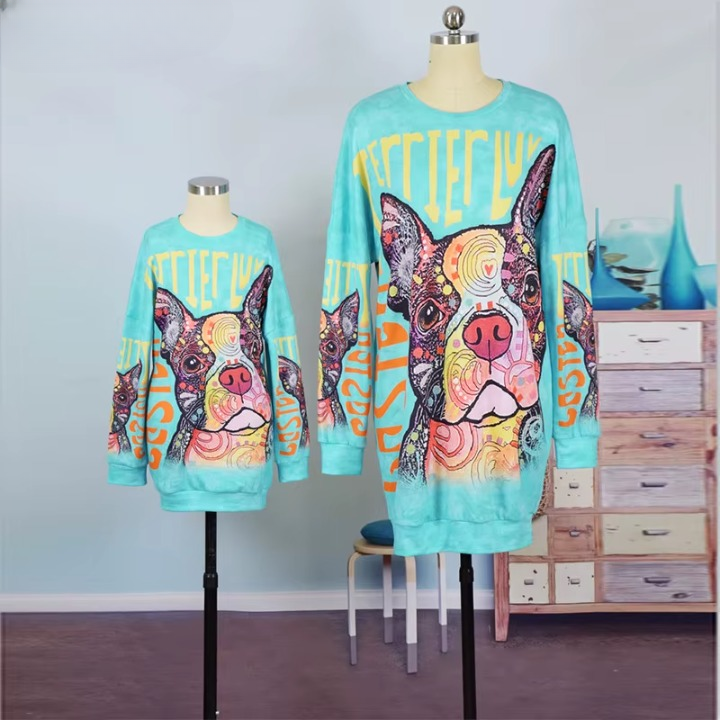 Put a smile on your face with the adorable dog head motif. A playful wink that will appeal to animal lovers as much as to fans of fashion pieces with a touch of originality. Its light blue color offers a fresh, light feel, perfect for brightening up your day, whatever the season. Slipped on in the blink of an eye, this sweatshirt dress promises softness and well-being. Made from quality fabric, its long sleeves will protect you from the evening chill. Its round collar provides a clean, elegant finish, offering a versatile look that will pair easily with a variety of accessories or shoes. Whether for a relaxed outing, an afternoon of play or a movie night at home, this Mother Daughter Dresses for Birthday is the perfect piece for sharing unforgettable mother-daughter moments. Add it to your basket and experience duo fashion in style and comfort!