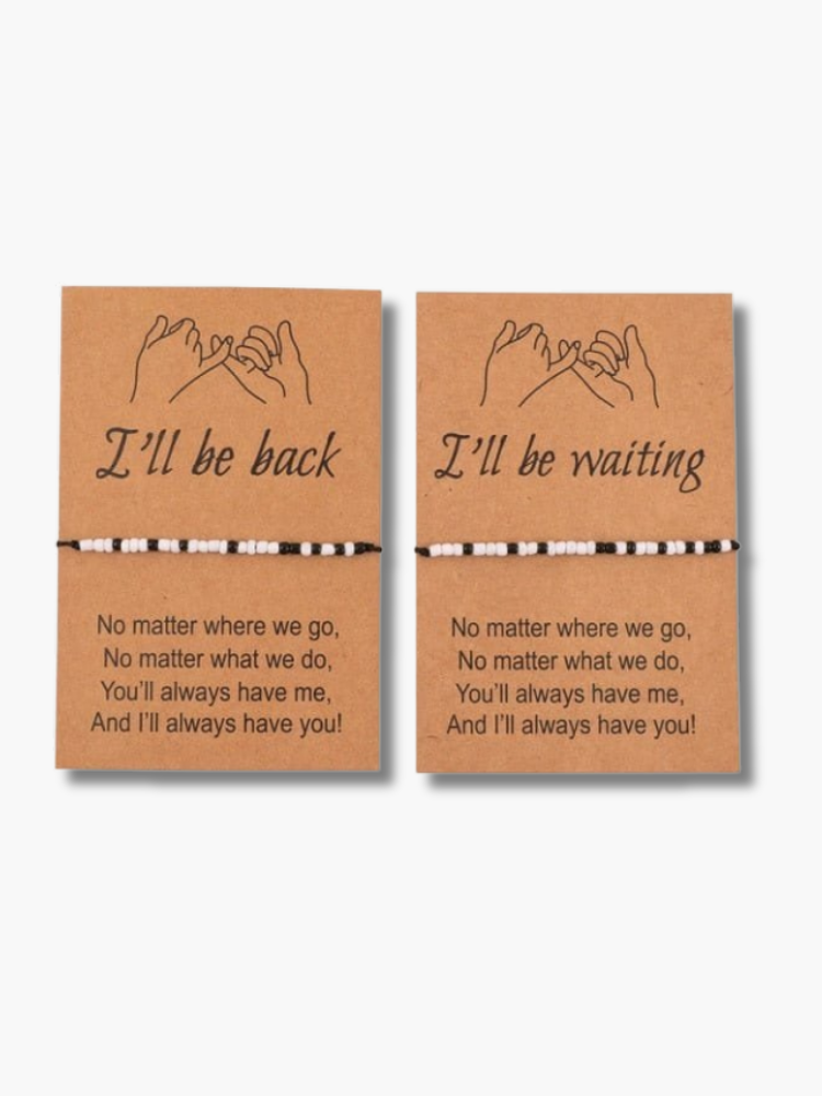 Our bracelets for couple are the silent promise that, no matter the distance, two souls remain connected, symbolizing dedication and patience in love. The thin black adjustable cord offers discreet elegance, ensuring that the bracelet fits comfortably on any wrist while remaining strong. Each bracelet is delicately adorned with small black and white beads, symbolizing balance and duality in a relationship. As in any love story, these contrasting colors recall the ups and downs, the joys and challenges. The set is accompanied by two heartfelt and touching cards with the phrase "I'll be back", and the other "I'll be waiting". These words evoke a timeless promise between lovers, reinforcing the oath of loyalty and expectation. These bracelets are more than just jewelry. They're a constant reminder that love, even when separated by distance, never wavers. Order yours today and seal your promise of eternal love.